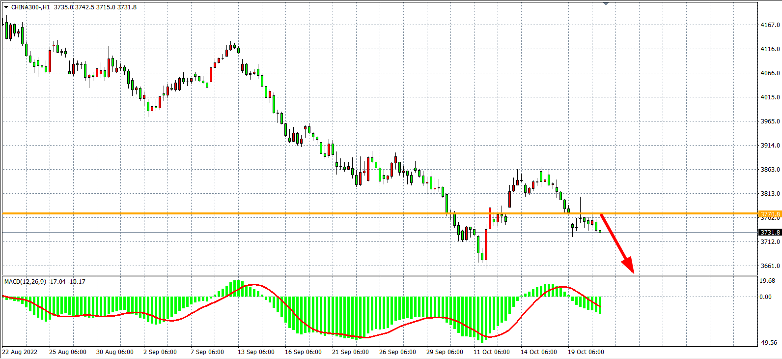 1小时图看,沪深300在反弹前一跳空缺口3770附近出现受阻回落,MACD于零轴之下开始重新放量,短期趋势仍旧走弱为主,日内在3770之下看跌,下方看3700-3660。