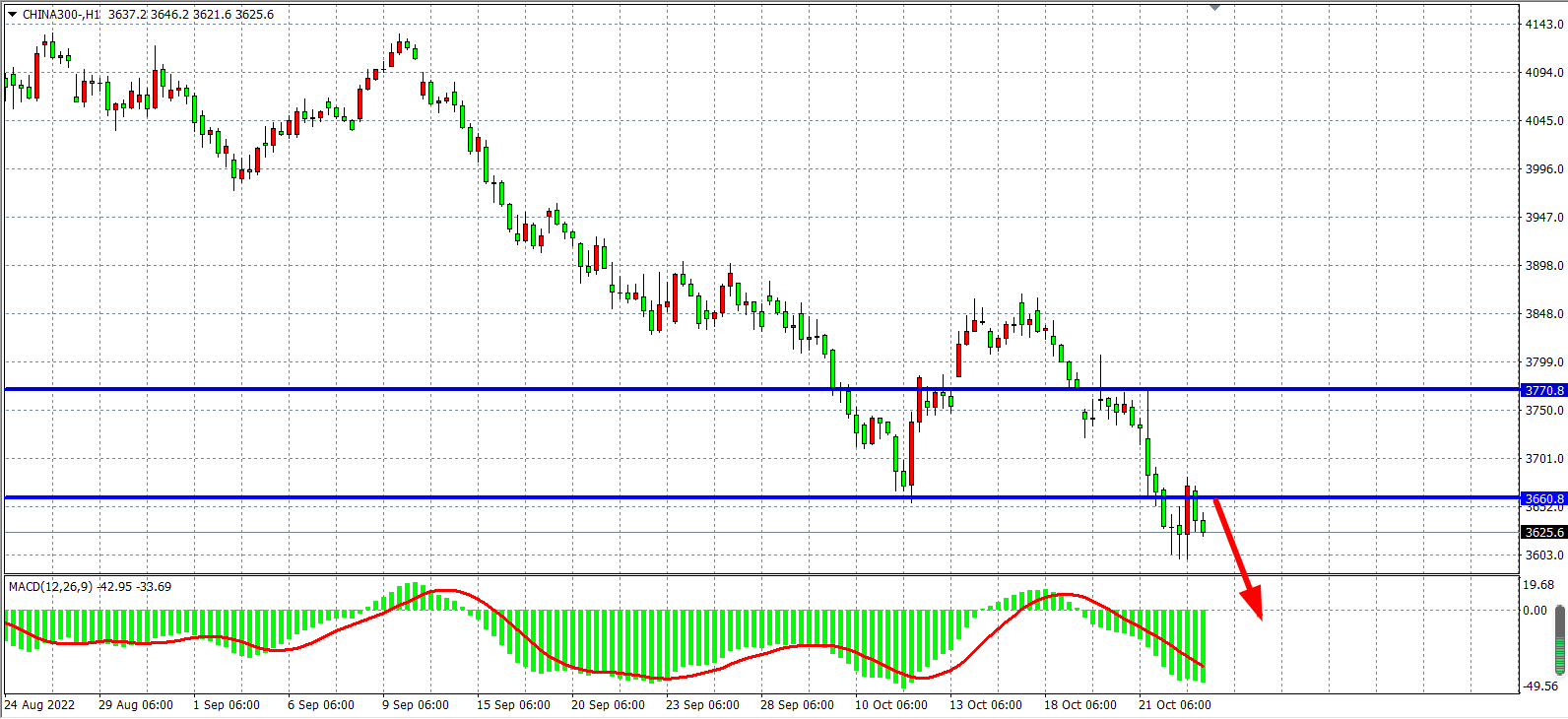 1小时图看,沪深300再度反弹压力3660附近再度出现受阻,MACD于零轴之下开始重新急剧放量,短期趋势显示空头开始加速,日内在3660之下继续看跌,下方看3600-3500。