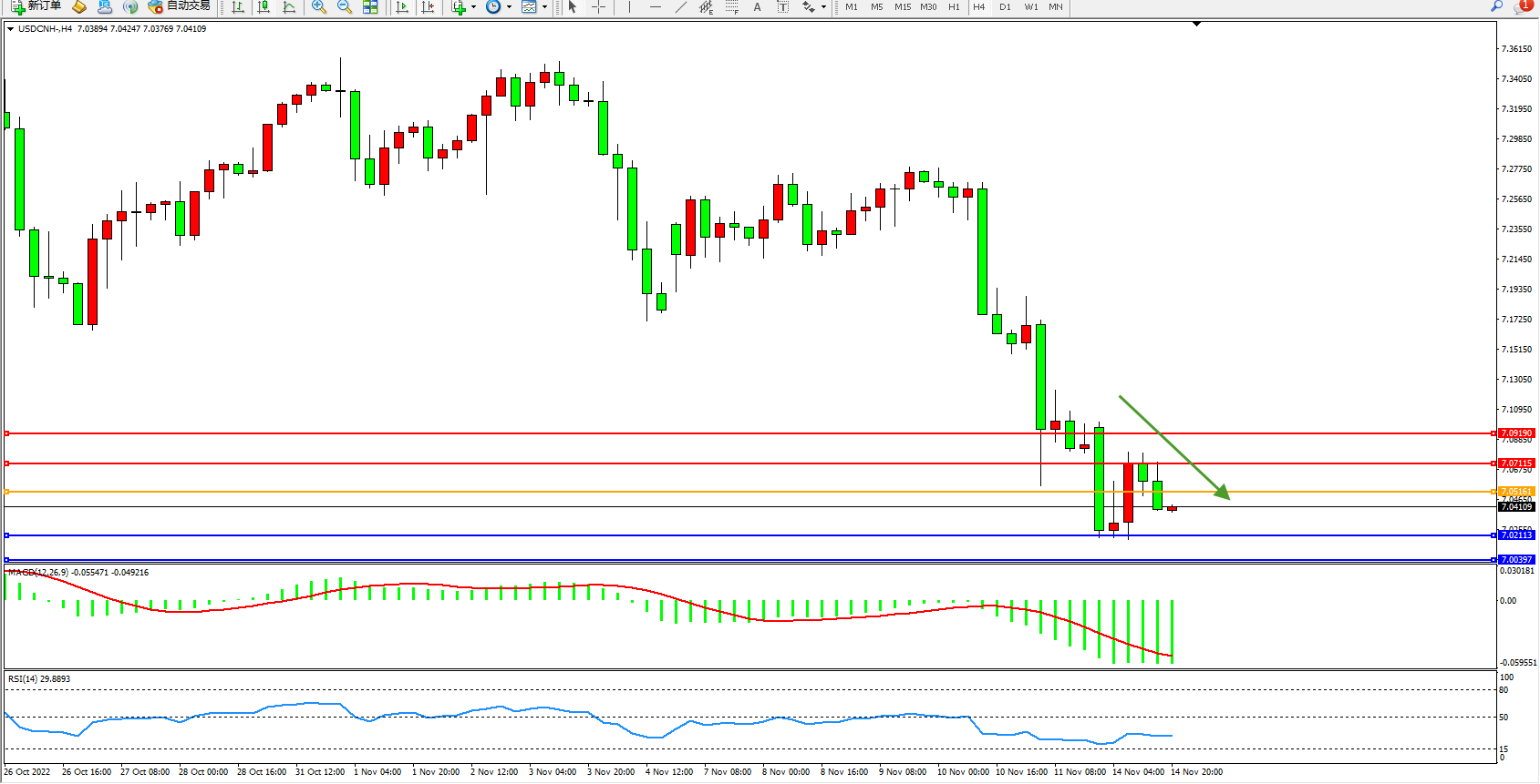 美元人民币USDCNH——4小时K线图显示: