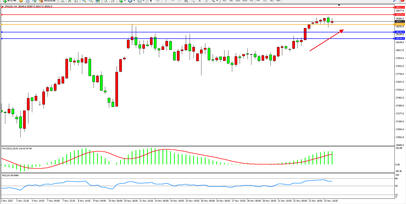 日经225指数11月22日(周二)收盘上涨180.21点,涨幅0.64%,报28125.00点。日本政府将全力应对眼下的生活成本危机,让经济重回增长轨道。日本通货膨胀率连续多月上涨,10月涨幅创40年来新高。周三日本东京证券交易所劳动感谢节,休市一日。