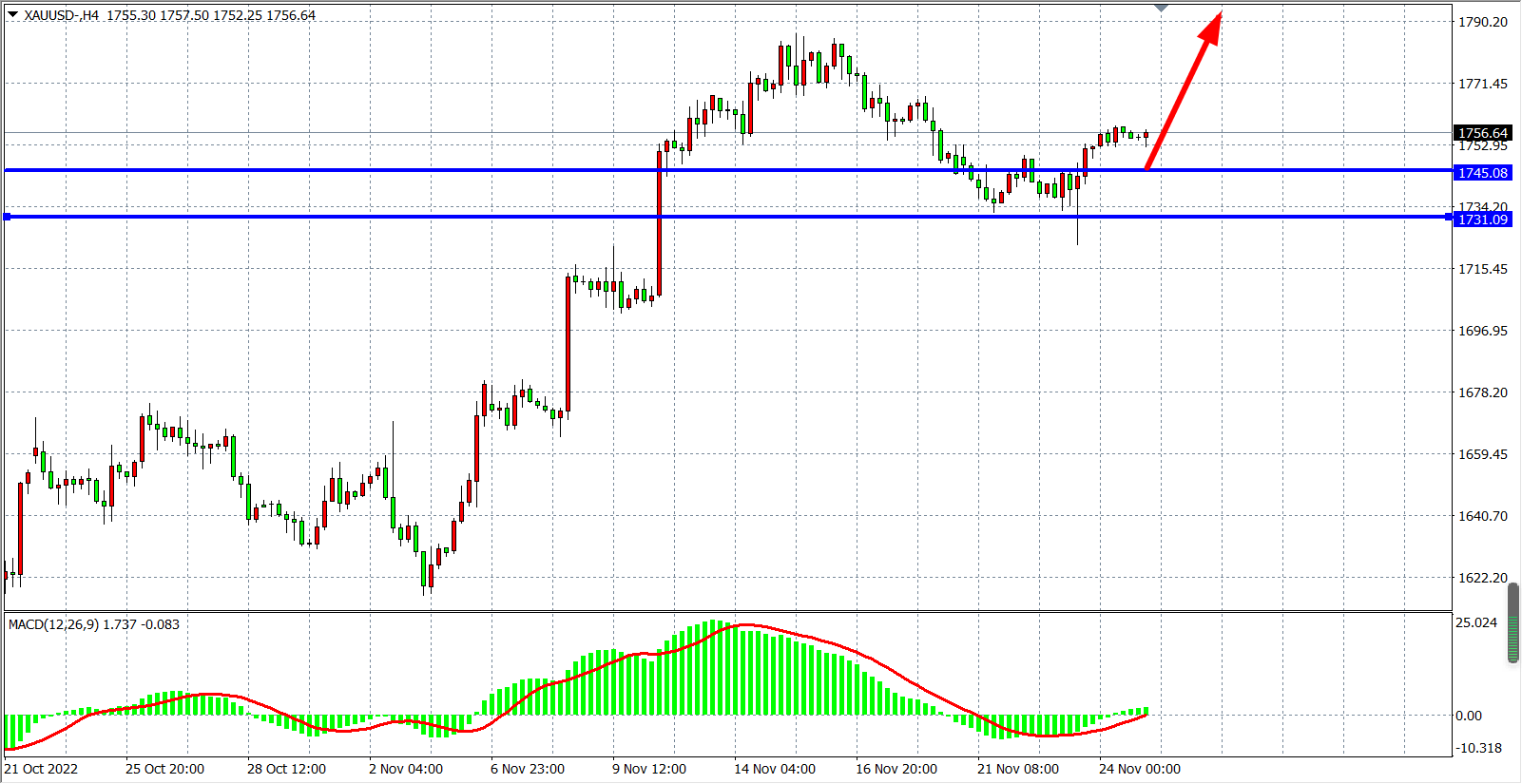 4小时图看,金价在1731支撑上开启反弹,同时MACD小幅上穿零轴,显示行情走势有进一步走强空间,当前支撑上移1745附近,日内在该位之上继续看涨,上方目标看1765-1785。