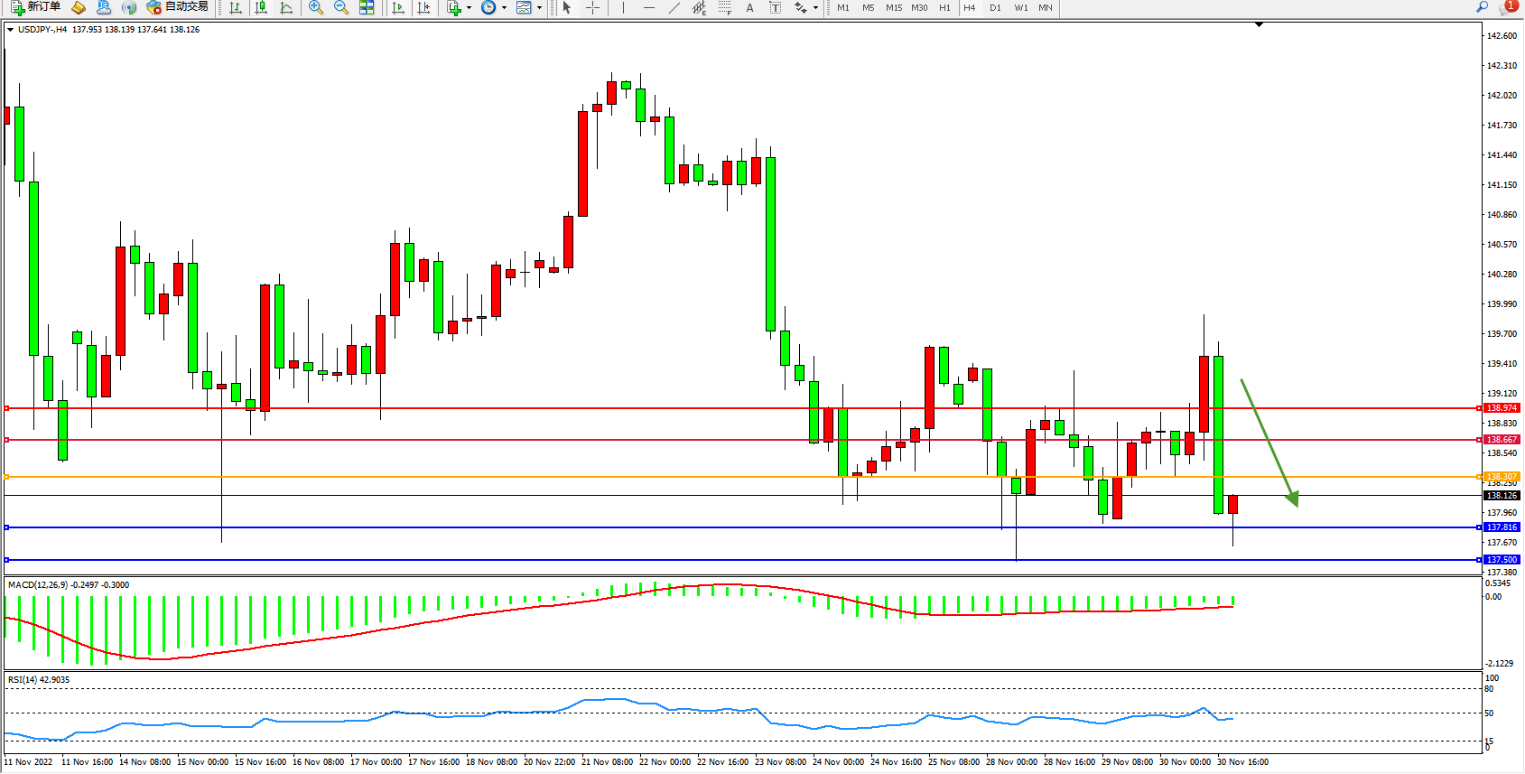 4小时图看:低位宽幅震荡,空头动力急速下挫,市场整体处于低位巨震中,MACD指标处于0轴线下侧弱势徘徊,RSI指标处于50均衡线下侧弱势整理;