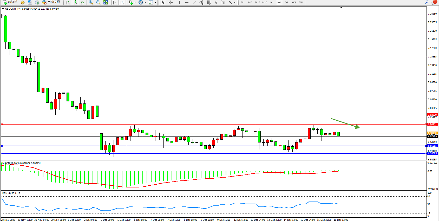 美元人民币USDCNH——4小时K线图显示: