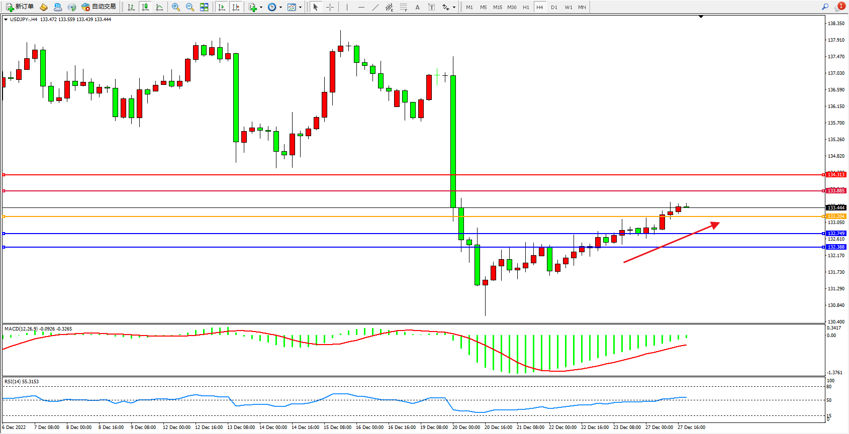 交易策略:133.204上方看涨,目标133.885、134.313