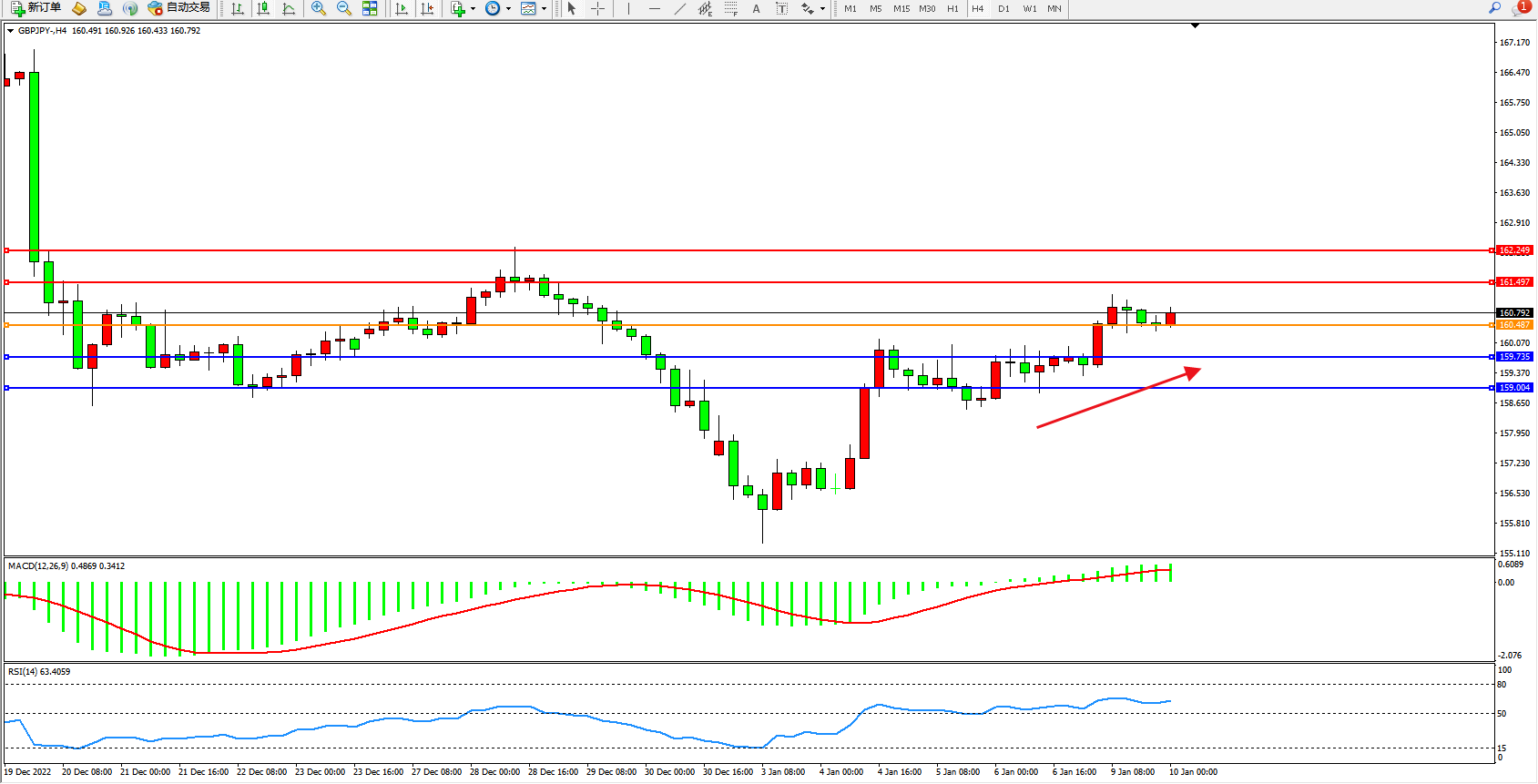 交易策略:160.487上方看涨,目标161.497、162.249