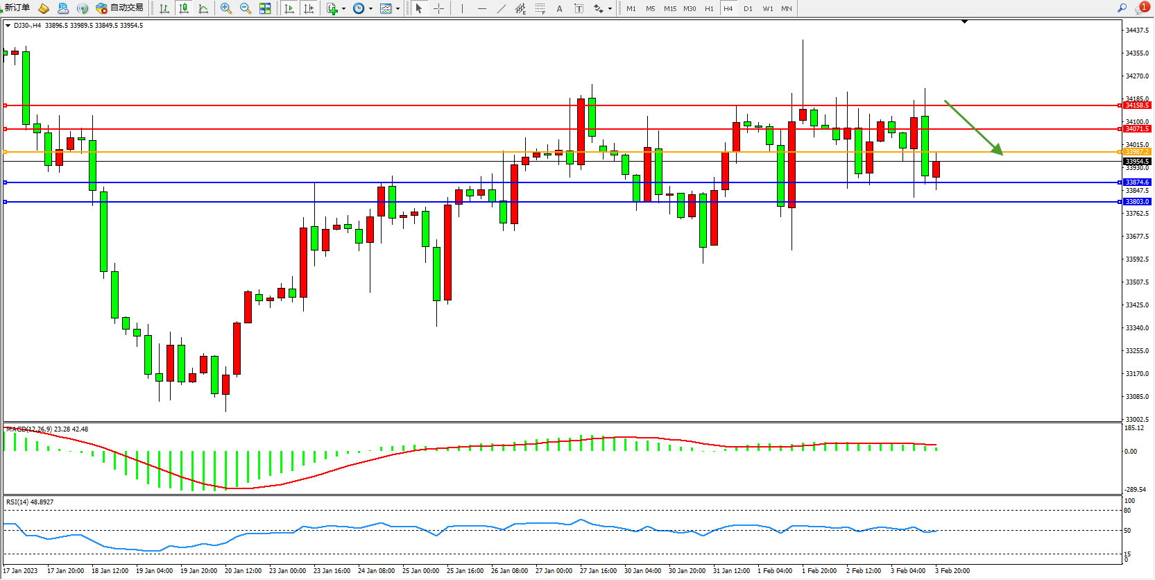 道琼斯指数2月3日(周五)收盘下跌128.88点,跌幅0.38%,报33925.06点;美国1月失业率 3.4%,预期3.60%,前值3.50%。美国1月季调后非农就业人口 51.7万人,预期18.5万人,前值22.3万人,为2022年7月以来最大增幅。