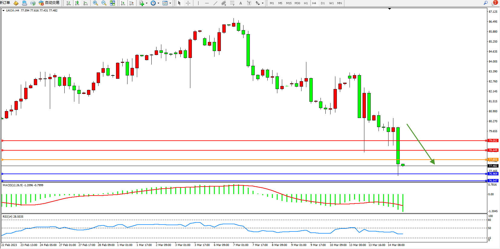 4小时图看:空头动力持续下挫,短期跌势未见止步,市场整体处于不断跌势,MACD指标处于区域不断下移,RSI指标处于空头区域低位整理;
