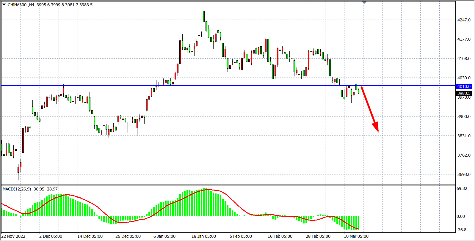 4小时图看,沪深300一度反弹但最终走势仍旧略显疲弱,维持在4010之下运行,该位短期压力明显,同时MACD于零轴之下量能较大,显示空头动能仍强劲,日内在4010之下继续看跌,下方目标3920-3850附近。