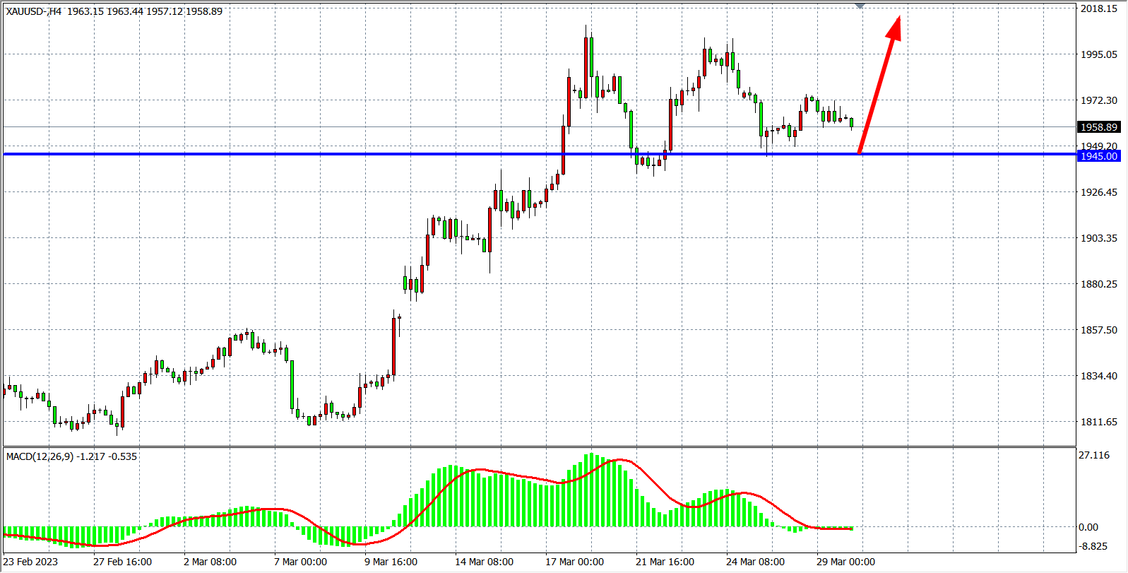 4小时图看,现货黄金反弹后小幅受阻回落,趋势进入窄幅盘整,MACD于零轴附近持续缩量,行情方向待选择,当前支撑继续关注1945附近,日内在该位之上看涨,目标1975-2000附近。
