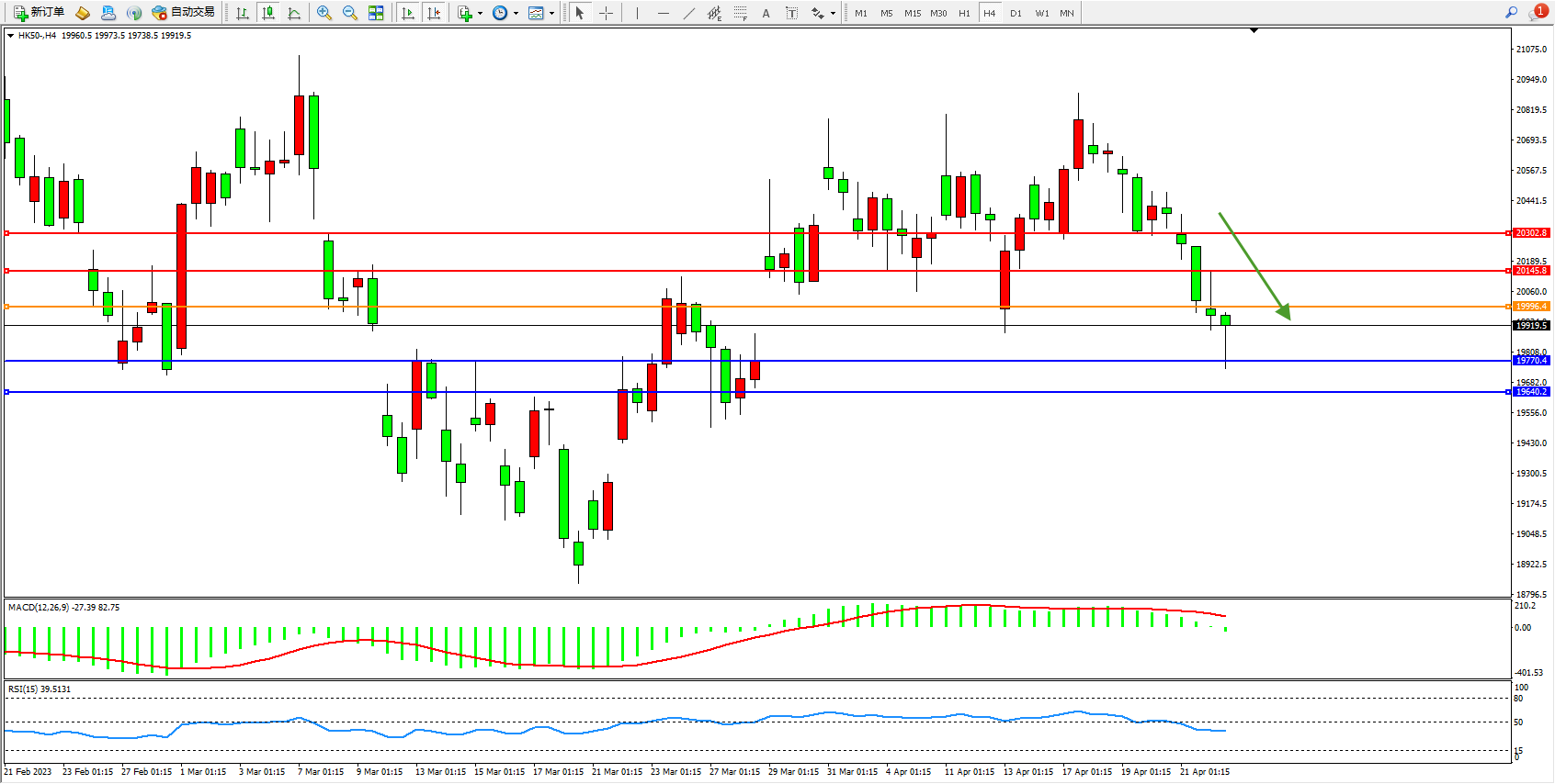 4小时图看:高位空头动力维持震荡下挫,短期跌势或将延续,市场整体处于空头动力不断向下移动中,MACD指标处于0轴线附近徘徊,RSI指标处于50均衡线下侧弱势整理;