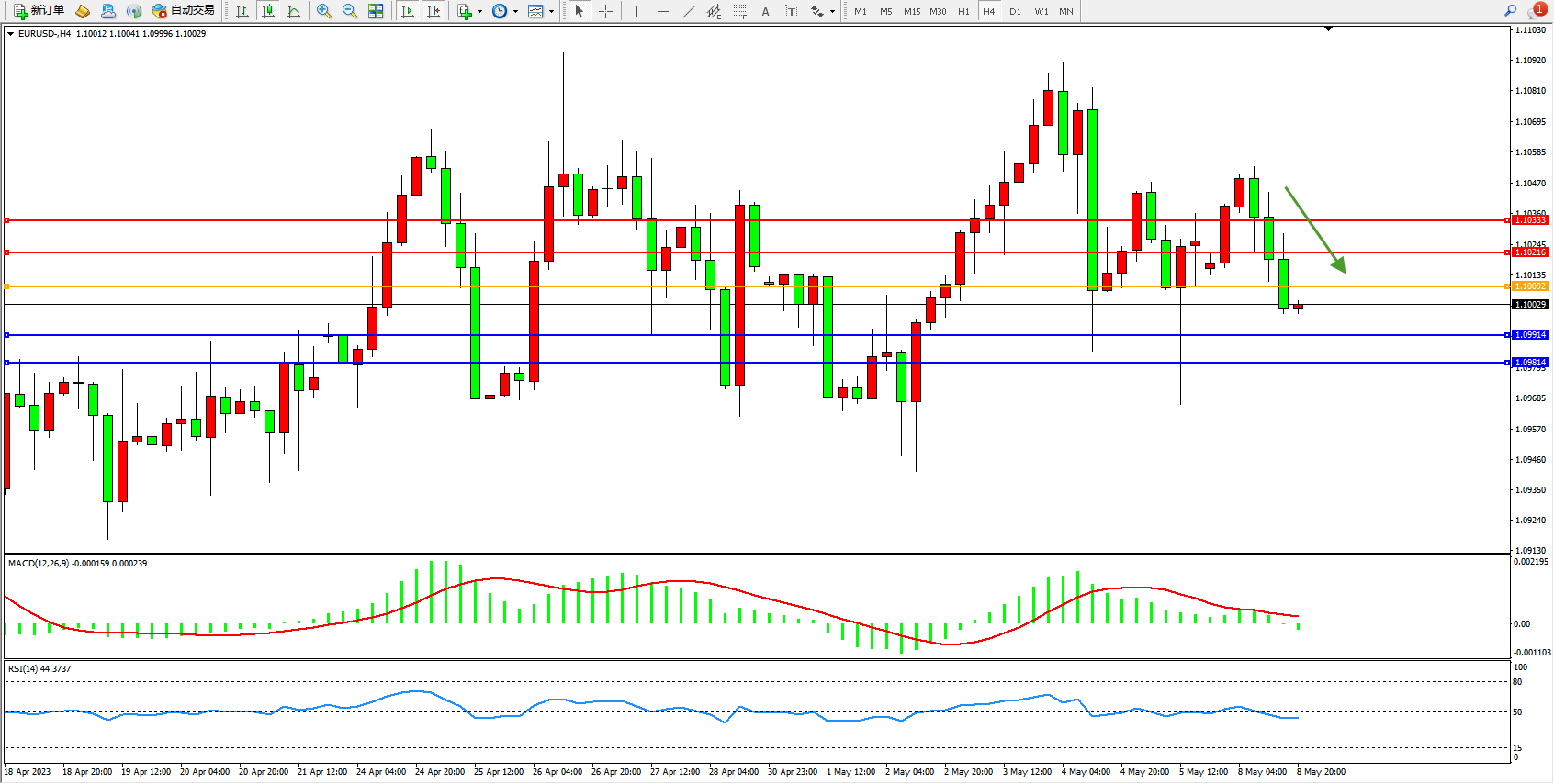 4小时图看:空头动力维持震荡下移,短期跌势或将延续,市场整体处于空头下行走势中,MACD指标处于0轴线附近整理,RSI指标处于50均衡线下侧弱势徘徊;