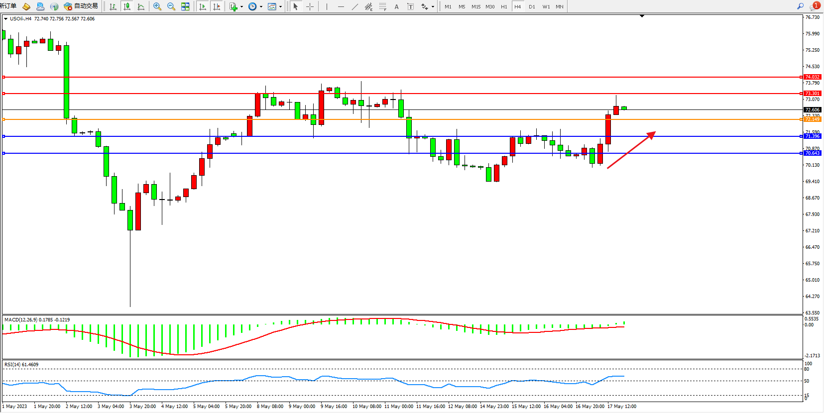 原油维持72.606附近震荡,美国至5月12日当周EIA原油库存 504万桶,预期-92万桶,前值295.1万桶。EIA俄克拉荷马州库欣原油库存 146.1万桶,前值39.7万桶。