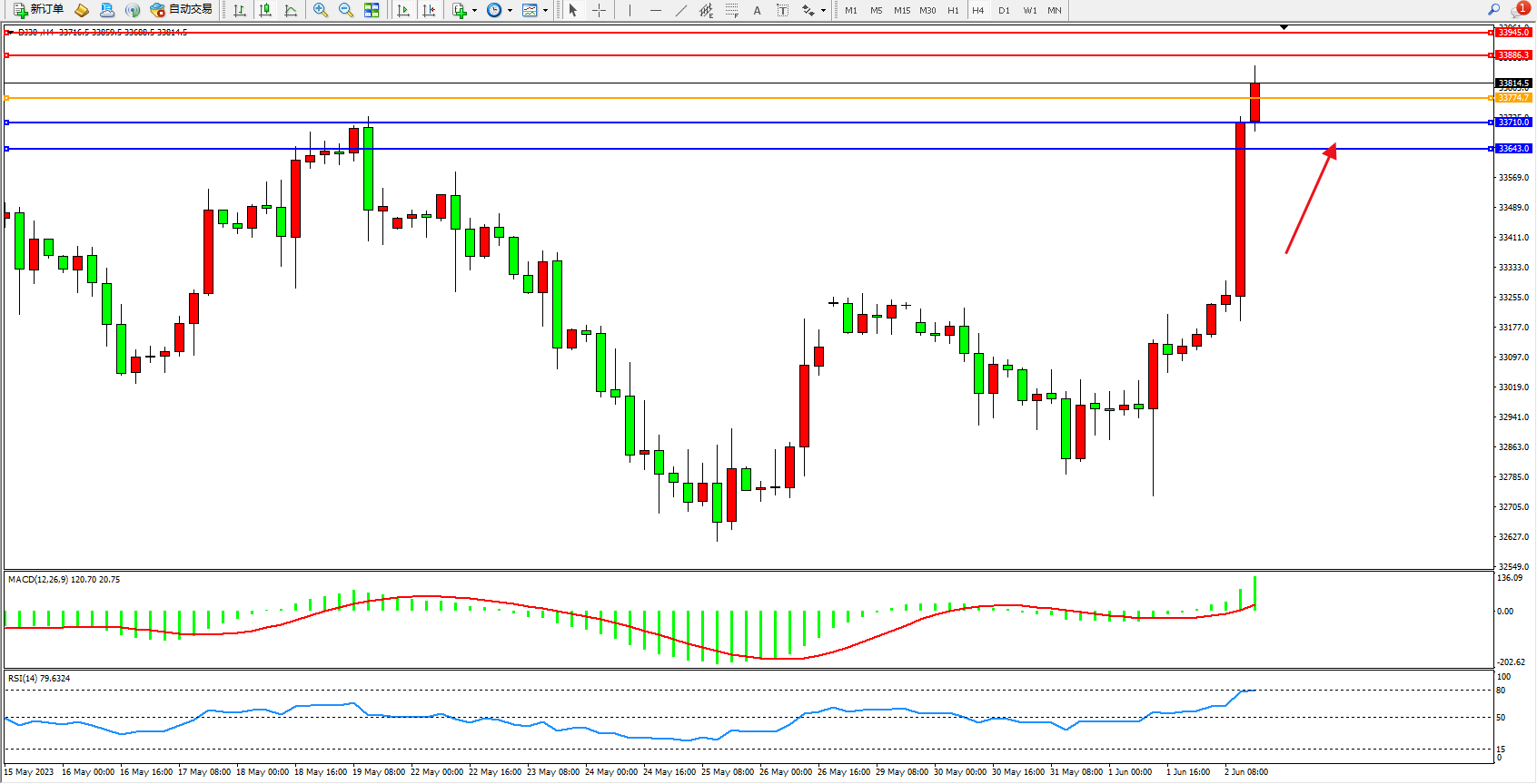 道琼斯指数6月2日(周五)收盘上涨701.19点,涨幅2.12%,报33762.76点;美国劳工部公布数据显示,美国5月非农新增28.3万,预期增加19万,失业率3.7%,预期3.5%,薪资年率4.3%,预期4.4%; 整体劳动力市场依然乐观,首次申请州失业救济金的人数徘徊在非常低的水平。