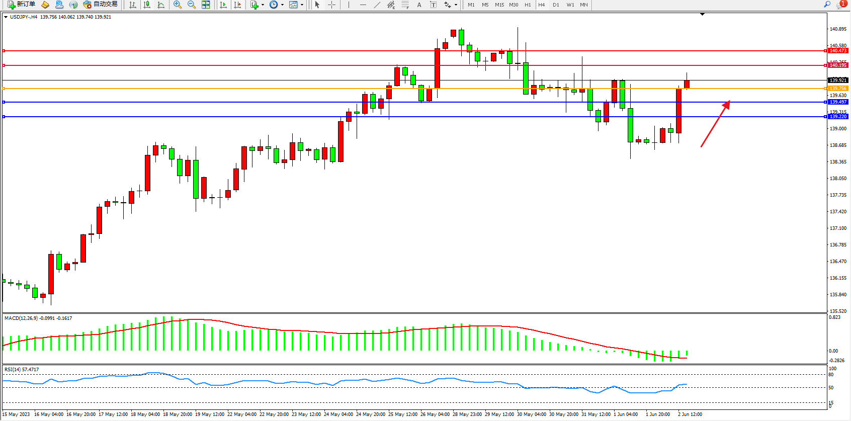 4小时图看:多头动力强势上扬,短期有继续向上移动态势,MACD指标处于0轴线下侧弱势整理,RSI指标处于50均衡线上側弱势徘徊;