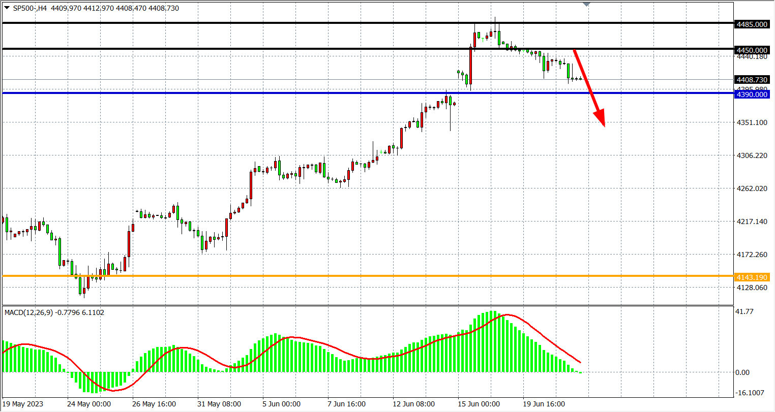 4小时图看,标普继续回落,压力下移4450附近,MACD量能在零轴上继续缩量,行情进入回调,下方支撑4390-4350,压力4450-4485。