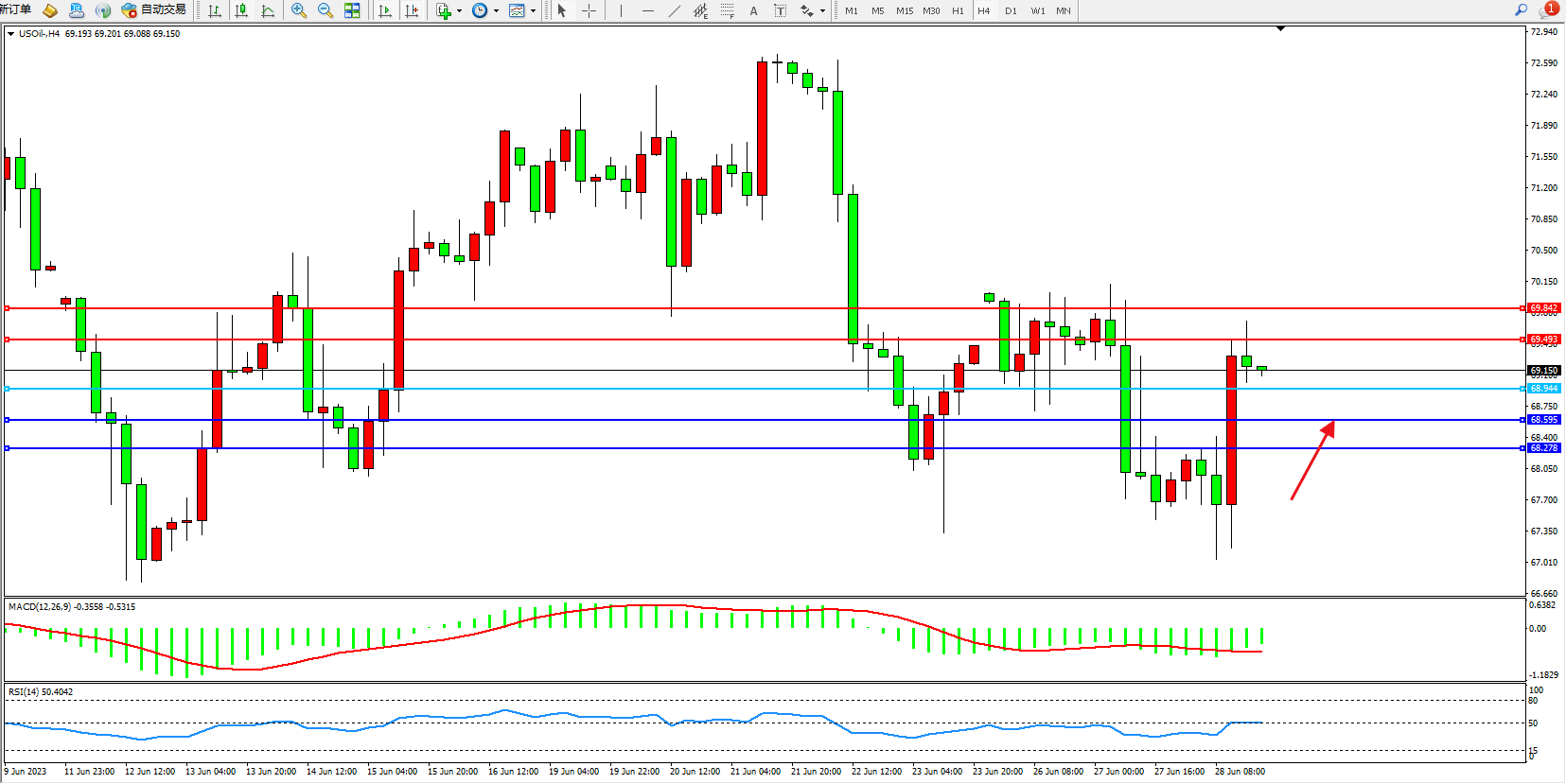 原油维持69.150附近震荡,美国至6月23日当周EIA原油库存 -960.3万桶,预期-175.7万桶,前值-383.1万桶。EIA俄克拉荷马州库欣原油库存 120.9万桶,前值-9.8万桶。