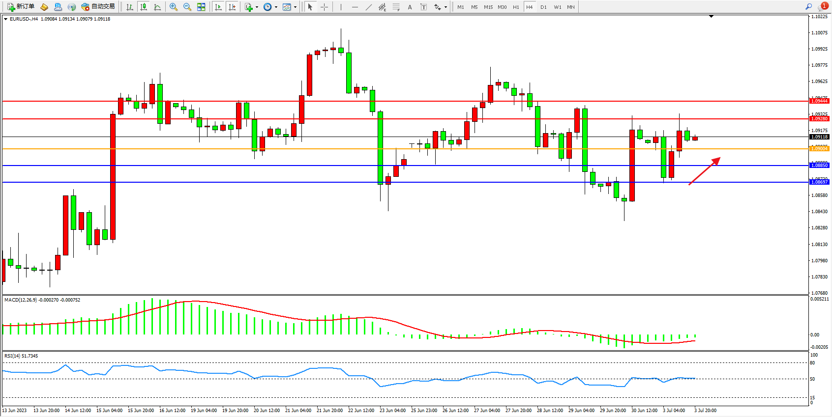 4小时图看:短期维持震荡,市场整体有继续宽幅震荡后上行迹象,MACD指标处于0轴线下侧弱势徘徊,RSI指标处于50均衡线附近弱势整理;