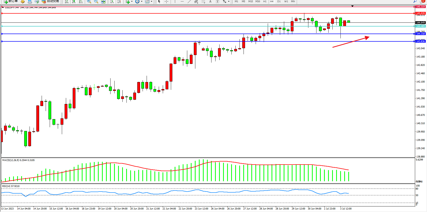 4小时图看:高位多头动力维持震荡上扬整理,市场看涨情绪依旧,短期有继续向上移动态势,MACD指标维持多头区域整理,RSI指标处于50均衡线上側弱势徘徊;