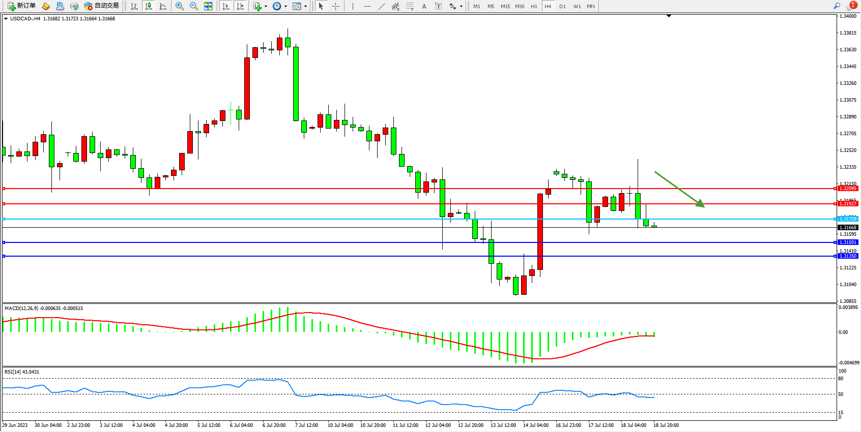 美元兑加元维持1.31668附近震荡,加拿大6月CPI月率录得0.1%,为2022年12月以来最小增幅。货币市场认为加拿大央行在九月加息的可能性为22%,低于通胀数据公布前的25%。