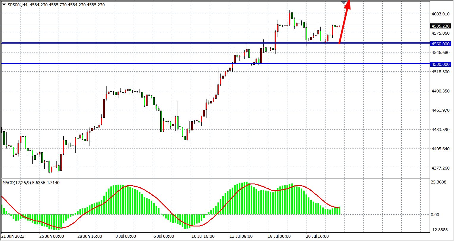 4小时图看,标普回落4560再度企稳走高,MACD量能在零轴上有所缩量,回调结束重新回归上行趋势,支撑继续关注4560附近,上方阻力4600-4640。