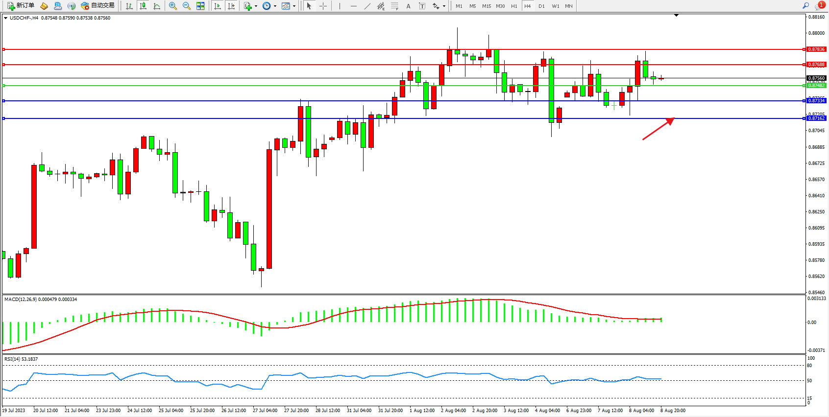 4小时图看:高位维持震荡,市场整体高位整理,短期或维持走势,MACD指标处于0轴线上側徘徊,RSI指标处于50均衡线上側弱势整理;