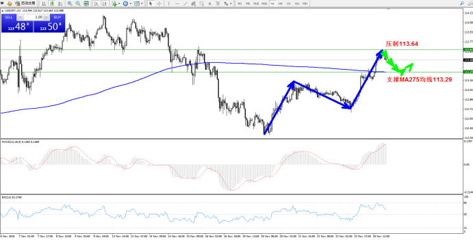 技术点评:1小时周期中,价格运行在上升通道中,高位113.64附近压制,支撑位于MA275均线113.29附近,MACD指标多头持续上扬后有些许疲软,RSI指标在多头区域80均衡线出现拐头下行态势。