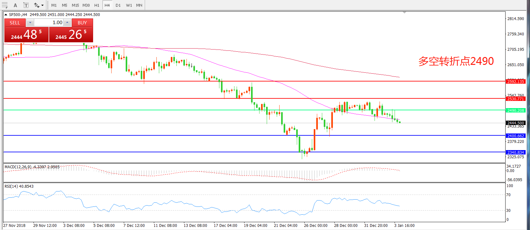 4小时图看,SP500站稳55均线后呈现整理走势,MACD绿柱缩短,RSI指标出现拐头,短期思路震荡偏空。