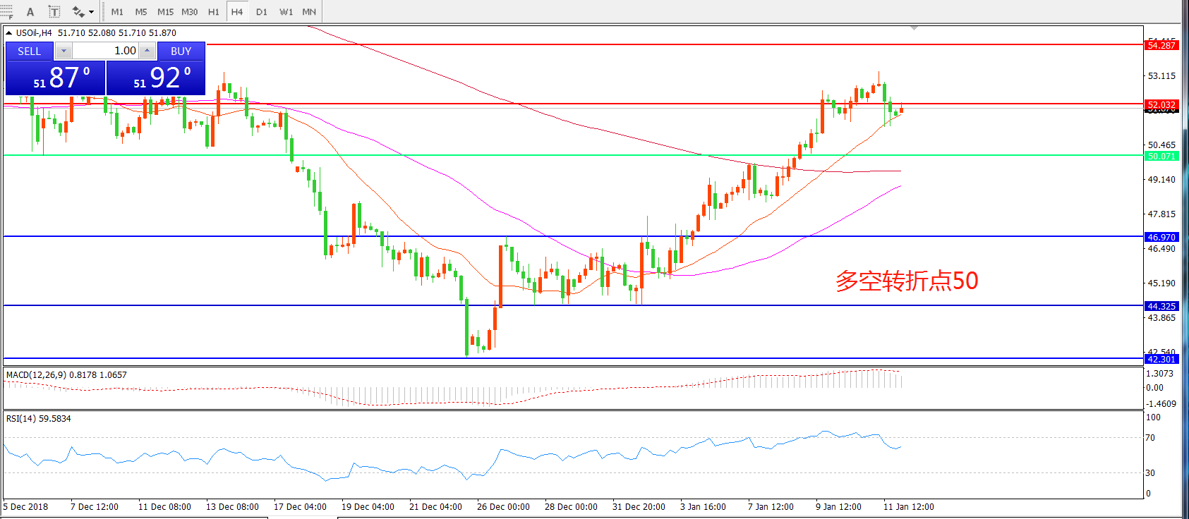 4小时图看,油价站稳50美金后稳步上行,冲击52美元后小幅回落, 均线系统呈多头排列,MACD红柱缩短,短线有回落风险,但整体走势偏多。