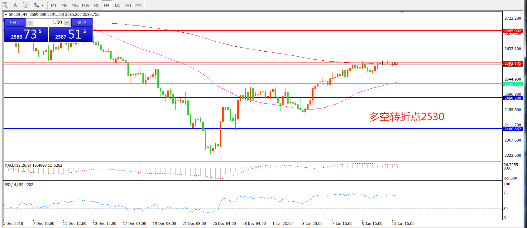 4小时图看,SP500站2490后维持小幅整理态势,均线系统逐渐走平,MACD红柱缩短,RSI指标出现拐头,短期看有一定回落风险。