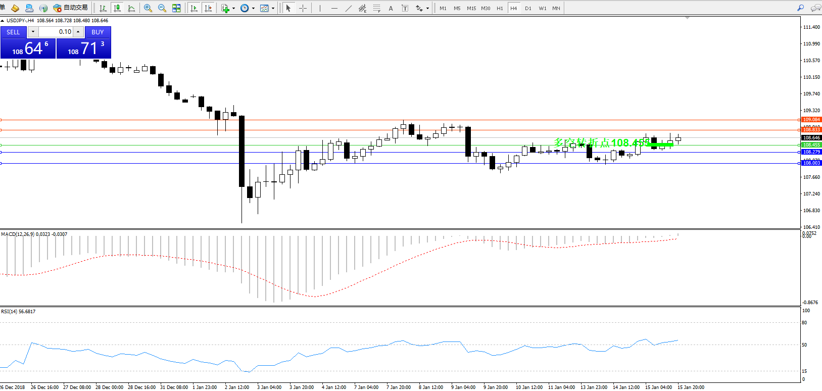 交易策略:108.455上方看涨,目标108.833、109.084