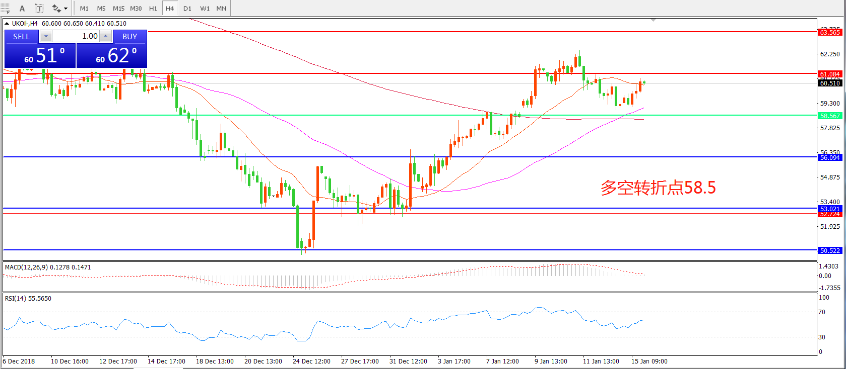 4小时图看,油价站稳58美金后陷入震荡,目前受阻于61美元,短期内呈现窄幅震荡形态, 均线系统仍呈多头排列,但MACD红柱缩短,短线有回落风险。