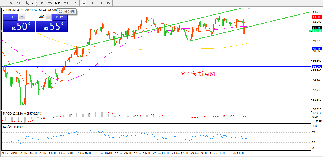 4小时图看,油价触碰63美金后回落,跌破下降通道后无力收复 。21均线有拐头迹象, MACD红柱缩减,日内有延续下行可能。