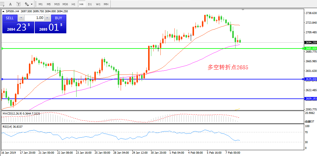 4小时图看,SP500震荡下行,21均线跌破后无力收复,MACD红柱缩短,短期有继续下行可能,重点关注2685一线支撑。