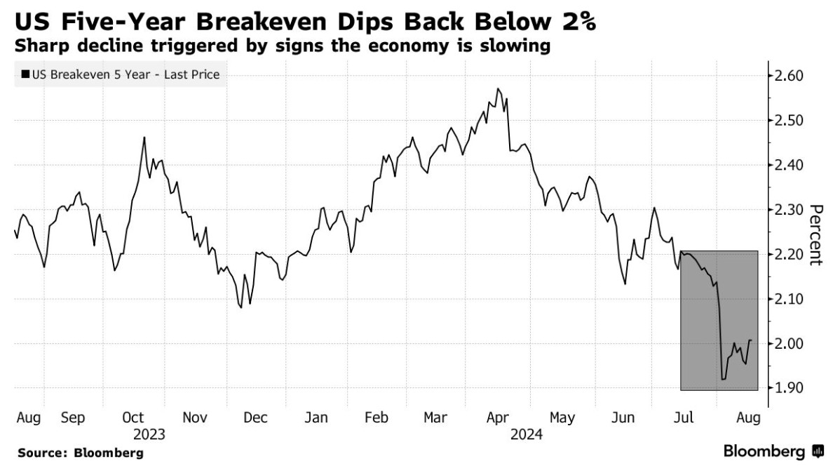 不过,许多投资者认为通胀指标已经跌得太多了。以美国五年期债券盈亏平衡利率为例,该利率是类似期限的通胀挂钩收益率与名义收益率之间的差额,是该时期平均价格上涨率的代表。随着经济衰退担忧加剧,该利率近几周大幅下跌,目前自 2021 年初以来首次跌至 2% 左右。