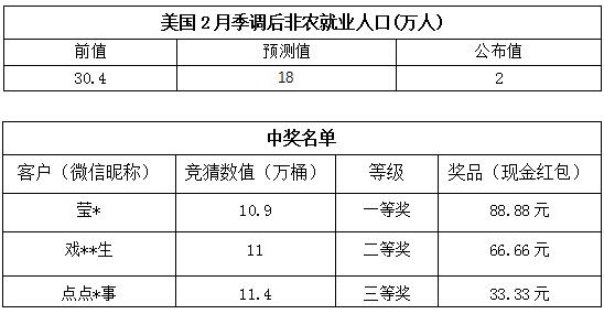 “2月份非农就业人数大竞猜”活动的中奖结果已出,获奖信息如下: