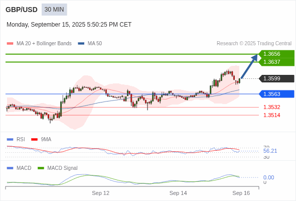 英镑/美元 当日内 : 看涨,当 1.3563 为支撑位,目标定在1.3656。