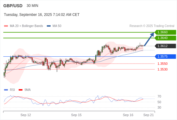 在 1.3575 之上,看涨,目标价位为 1.3640 ,然后为 1.3660 。
