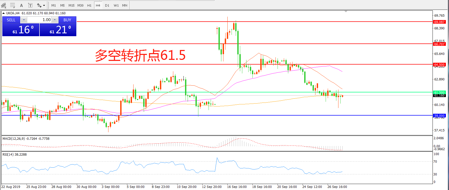 刚刚过去的一周,国际油价震荡走弱,欧洲经济疲软、特朗普“弹劾门”、EIA原油库存意外增加、沙特原油产能恢复速度快于预期、中东紧张局势缓和,这些都令油价承压,布伦特原油最低触及59.82美元/桶,收报61.16美元/桶,周线跌幅为5.54%。美国炼油厂进入维修期,需求面比较糟糕,如果国际贸易局势如果出现改善,将有望给油价提供支撑。