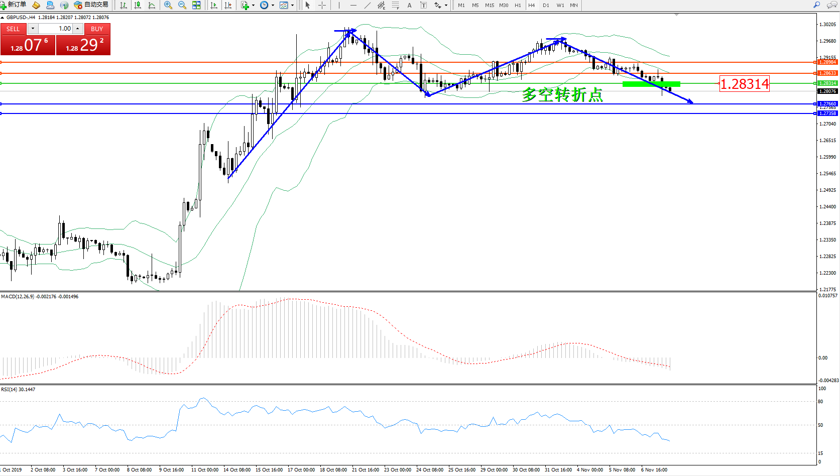 交易策略:1.28314下方看跌,目标1.27660、1.27358