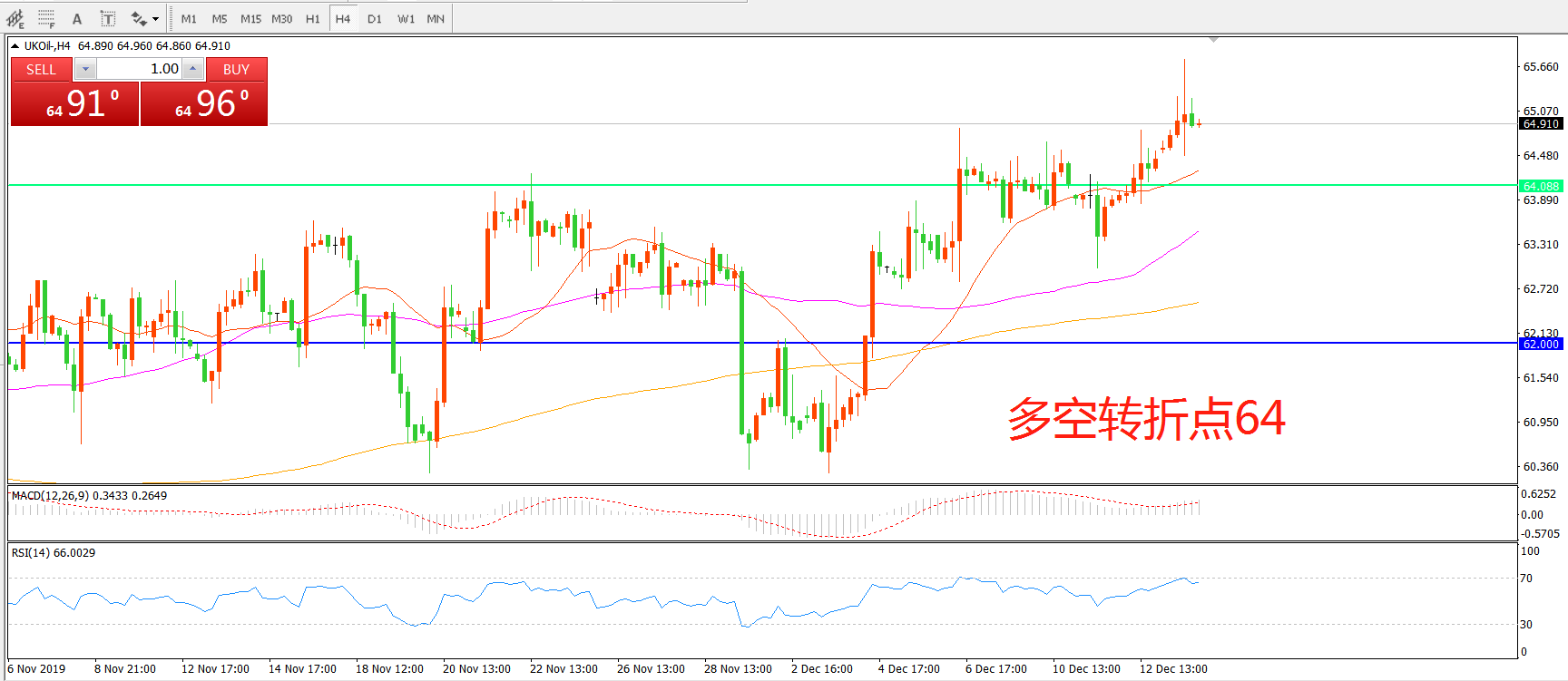 4小时图看,油价连续反弹,整体走势偏强,64美元被突破后,有加速上行的趋势,均线系统呈多头排列,MACD红柱增加,RSI指标走平,日内延续上行概率较大。