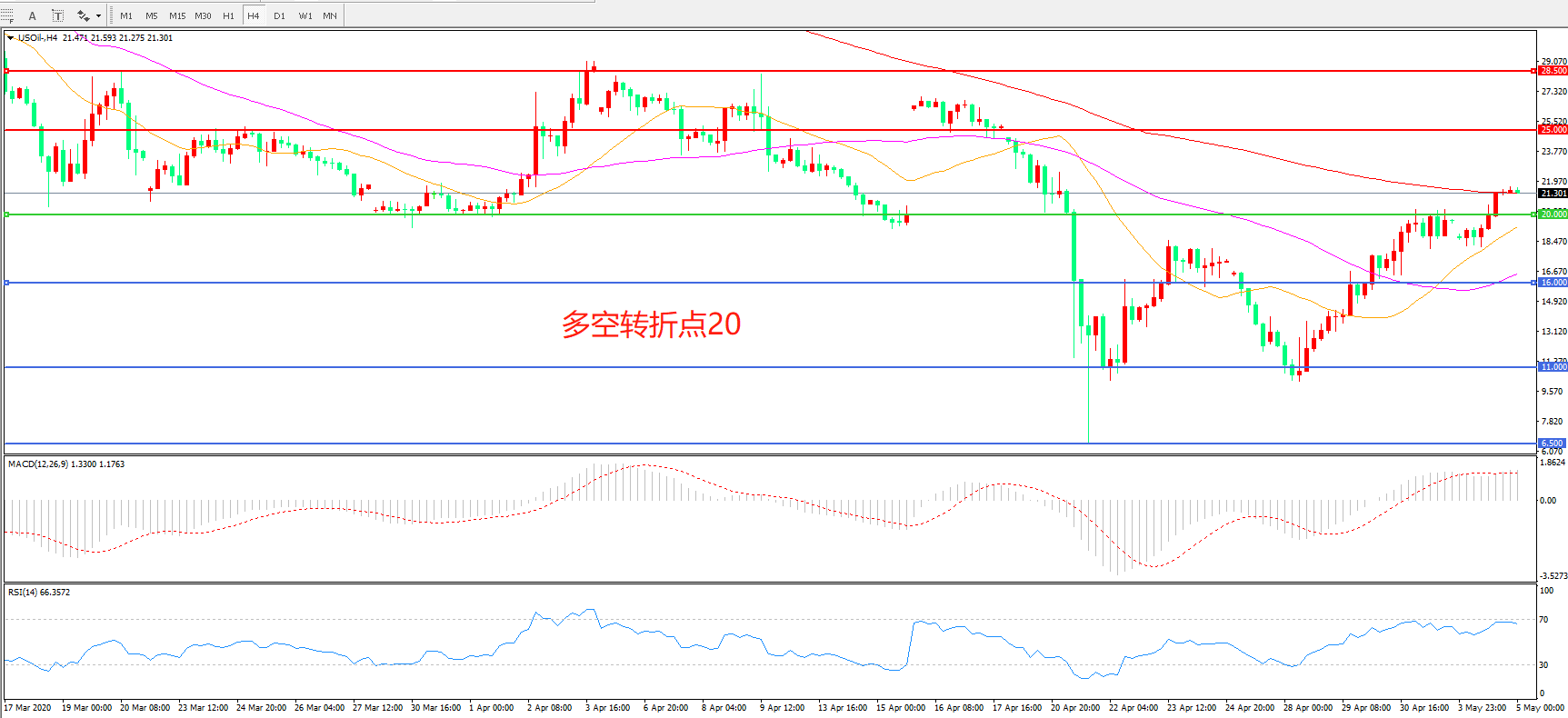 周一(5月5日),因多个国家宣布将开始放松控制疫情相关封锁措施,且主要产油国和企业削减原油供应,油价大幅飙升,WTI原油一度涨超8%,最终收于20美元上方,周二早盘, WTI原油高开4.51%,截止发稿前,收报21.28美元/桶。