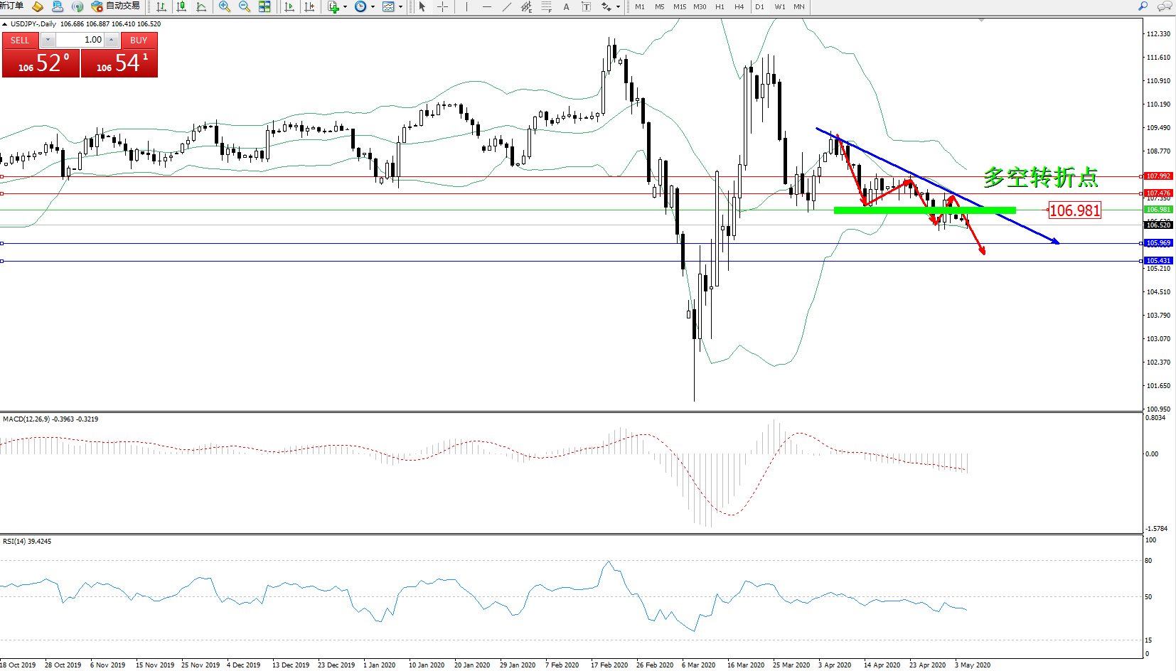 美元兑日圆重心下移,全球贸易环境紧张局势加剧,对新一轮贸易争端的担忧燃起,推动投资者寻求避险,日元连续三日走高,且此前日本政府新冠肺炎专家小组成员表示,出现了一些积极迹象,尽管检测人数增加了,但新增确诊人数却下降了,日本首相安倍晋三此前表示,把紧急状态延长至531日,地区性紧急框架将继续适用。