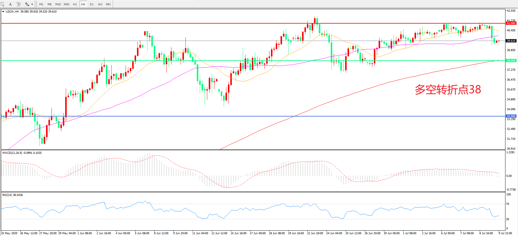周三(7月8日),美国新冠确诊人数单日突破6万引发市场恐慌,风险资产遭到抛售,美国WTI原油大幅下挫,收报39.62美元/桶。在OPEC及其盟友7月15日召开市场监督小组会议之前,市场更多时候会处于多空拉锯状态,短线出现暴跌的概率不大。目前的回调可能有利于空头积攒人气,但也有利于多头修复过高的指标,因此在行情没有出现明显的趋势之前,依旧当作震荡处理。