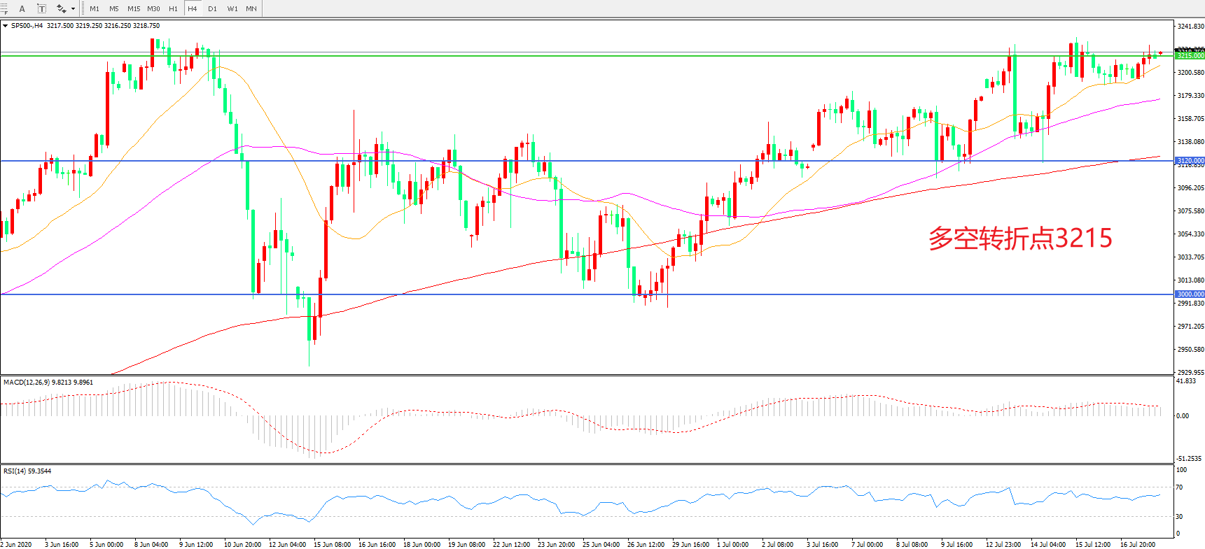 4小时图看,标普500延续高位震荡,短期涨势暂缓,均线系统呈多头排列, MACD红柱减少,RSI指标走平,日内延续震荡概率较大。