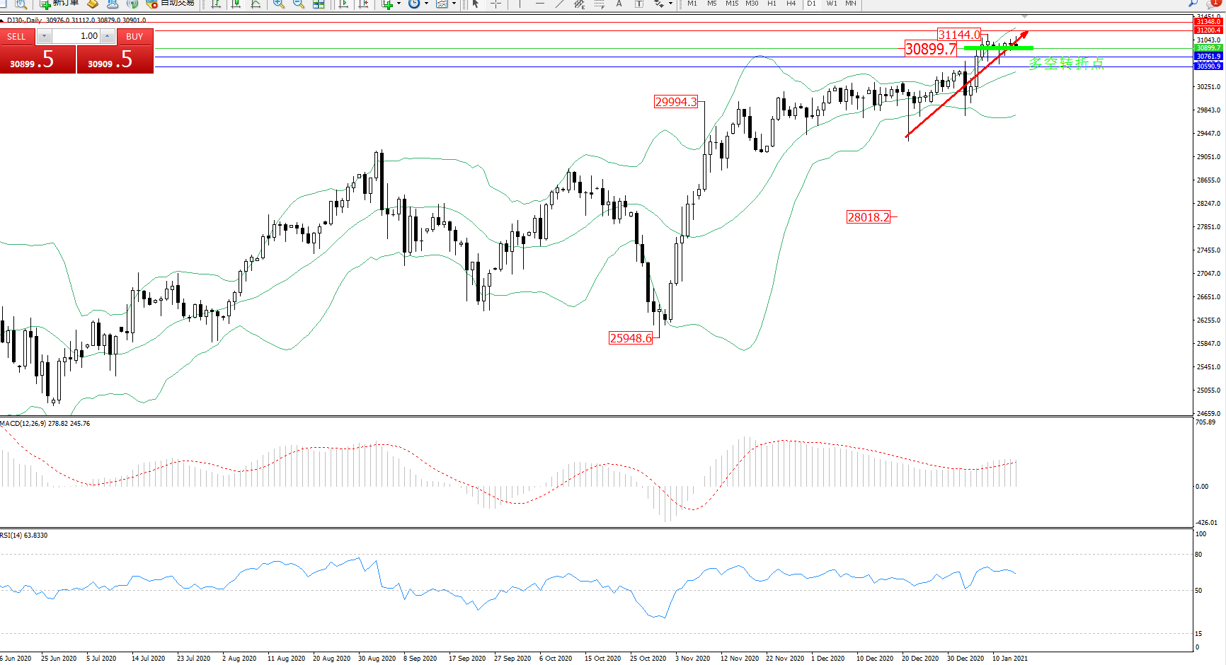 技术点评:多头动力延续布林带指标通道上轨附近弱势震荡向上移动中,高位抵达31144位置节点后出现整理回撤走势,布林带指标呈张口走势中,多头动力有继续拉升上扬态势,关注上轨附近关键节点,MACD指标处于0轴线上方多头区域维持整理平移后有向上移动迹象,RSI指标处于50均衡线上方多头区域维持震荡平移中;