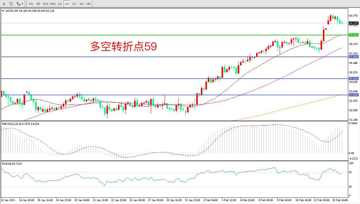 4小时图看,油价连续上涨后高开高走,上行趋势十分明显,60美元被强势突破,行情进入加速上行阶段,MACD红柱增加,RSI指标向上,日内延续上行概率较大。