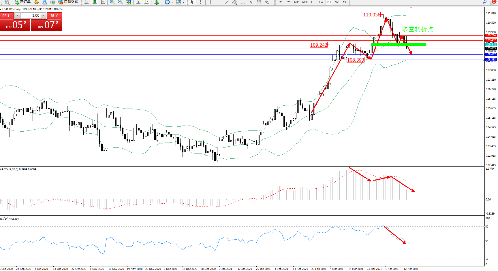 技术点评:多头动力延续布林带指标中上轨区间通道持续震荡上扬,高位抵达110.956位置遇阻回撤,跌破布林带指标中轨附近节点后维持宽幅震荡,空头动力依旧有继续下行迹象,布林带指标呈张口走势后开始缓慢收口,关注中轨附近节点,MACD指标处于多头区域高位震荡回撤,RSI指标高位持续回撤下行触及0轴线附近节点;