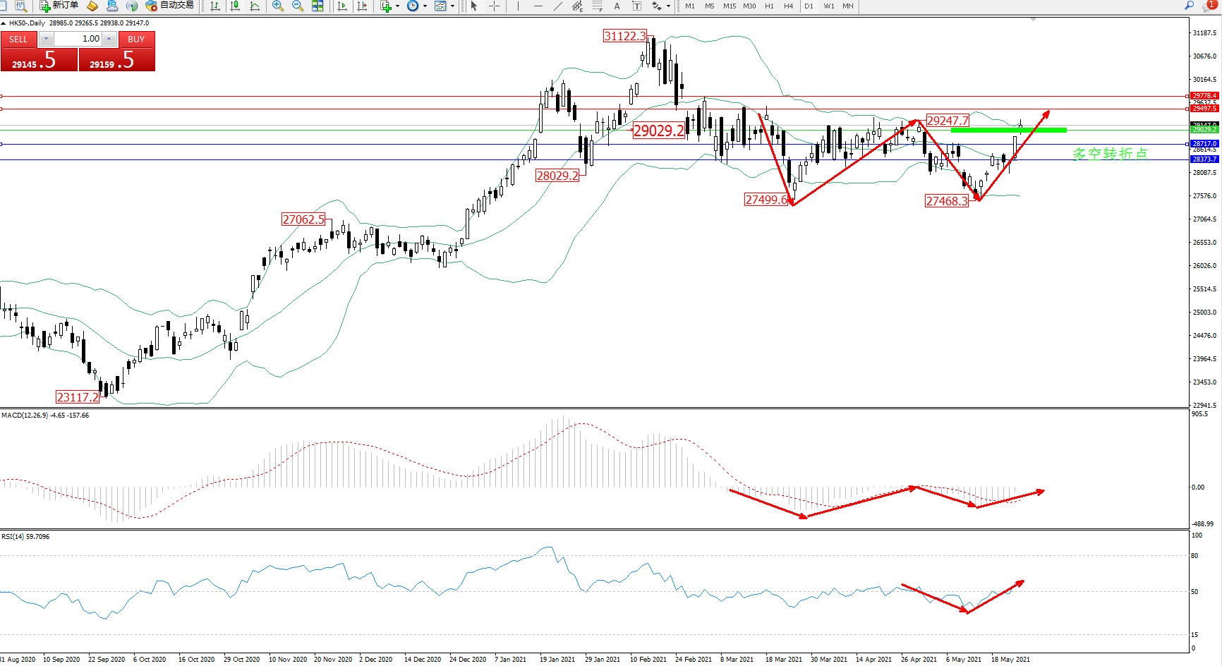 技术点评:低位多头动力持续震荡上扬,触及布林带指标上轨附近节点后开始有破位上移迹象,呈W底形态震荡回升,布林带指标呈收口平移走势持续震荡,多头动力有进一步向上移动态势,MACD指标处于0轴线下方空头区域弱势震荡回升,RSI指标低位多头动力持续震荡上移至50均衡线附近后继续拉升上行中;