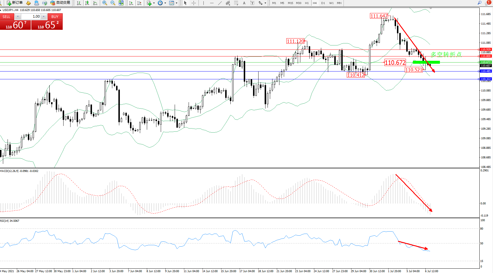 技术点评:高位空头动力持续震荡下行,抵达布林带指标下轨附近后不断弱势向下移动中,跌势未见止步态势,此前低位110.412附近节点近在咫尺破位在即,布林带指标呈收口走势后开始缓慢向下移动中,MACD指标空头动力跌破0轴线进入空头区域低位不断下移中,RSI指标处于50均衡线下方空头区域不断徘徊下行中;