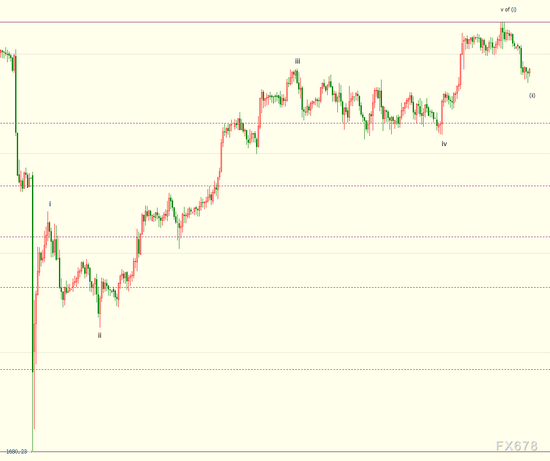 小时图上看,金价自1810美元开启回调(ii)浪走势,下方支撑看到1779美元,它是自1680美元开启的上行(i)浪的23.6%斐波那契回档位。(i)浪是同样自1680美元开启的上行((i))浪的子浪。